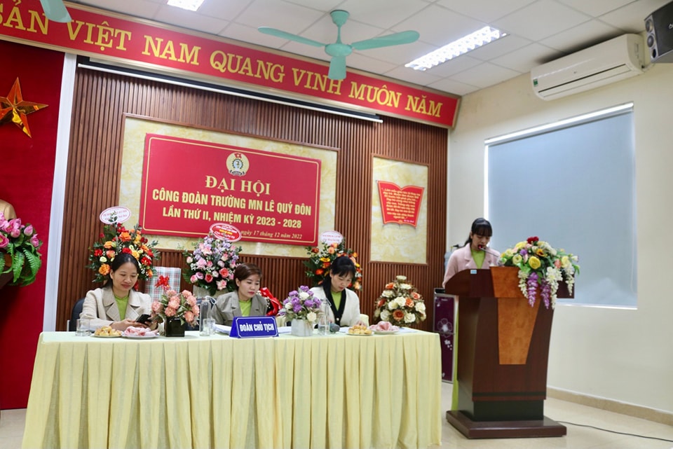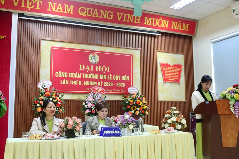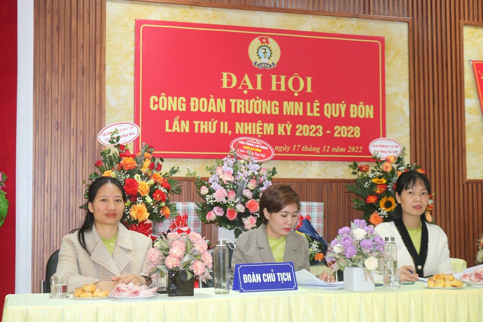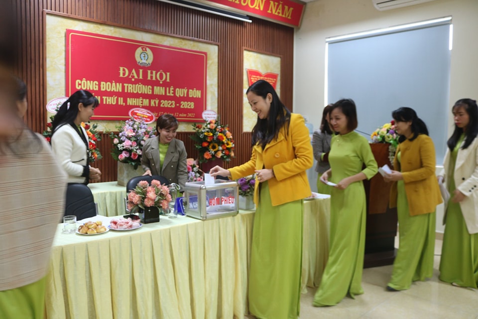 Sau một thời gian làm việc nghiêm túc và hiệu quả, Đại Hội đã sáng suốt lựa chọn và bầu BCH công đoàn Trường MN Lê Quý Đôn khóa mới gồm 03 đồng chí có đức, có tài, nhiệt tình, tâm huyết và trách nhiệ thực hiện trọng trách mà Đại Hội giao phó gồm các đồng chí: Đ/c Đào Thị Sen - Phó Hiệu trưởng, Đ/c Nguyễn Thị Phương Dung - Giáo viên tổ 4 tuổi, Đ/c Nguyễn Thị Thảo - Tổ trưởng Tổ MGN 4-5 tuổi. Đồng thời Đại hội đã bầu ra đ/c đại biểu chính thức tham dự Đại hội công đoàn Quận Hà Đông lần thứ XI, nhiệm kì 2023-2028