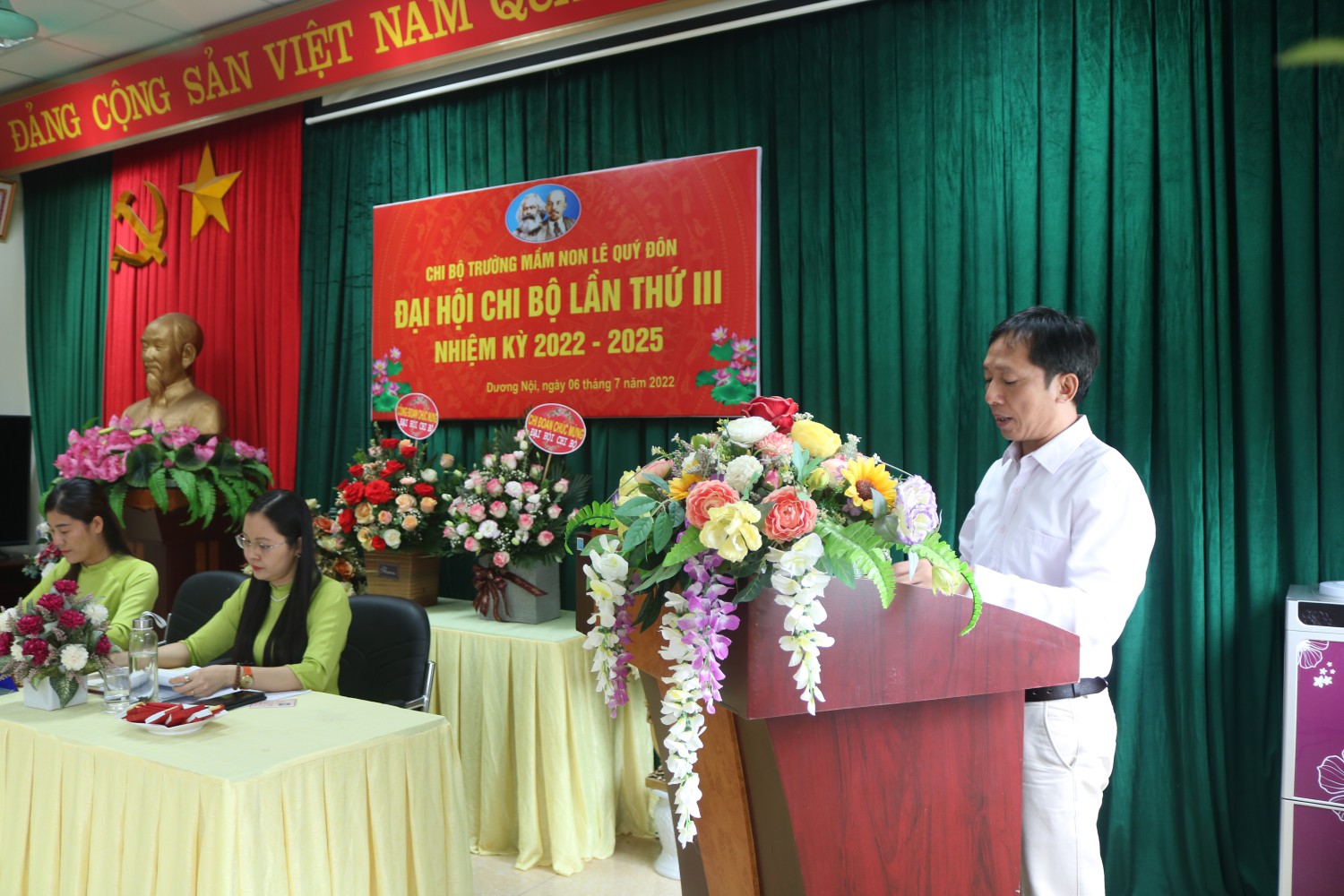 Thực hiện Điều lệ Đảng cộng sản Việt Nam; Thực hiện Kế hoạch số 68-KH/ĐU ngày 28/02/222 của Đảng ủy phường Dương Nội về việc lãnh đạo tổ chức Đại hội các Chi bộ trực thuộc nhiệm kỳ 2022-2025. Được sự nhất trí của Ban Thường vụ Đảng ủy phường Dương Nội. Hôm nay, ngày 6/7/2022, Chi bộ trường MN Lê Quý Đôn trang trọng tổ chức Đại hội Chi bộ Lần Thứ III nhiệm kỳ 2022-2025.