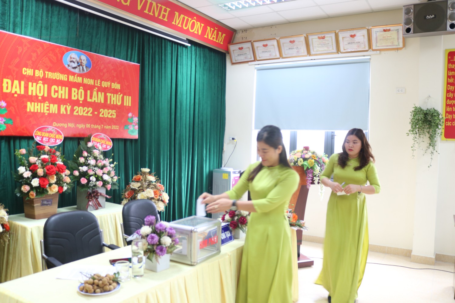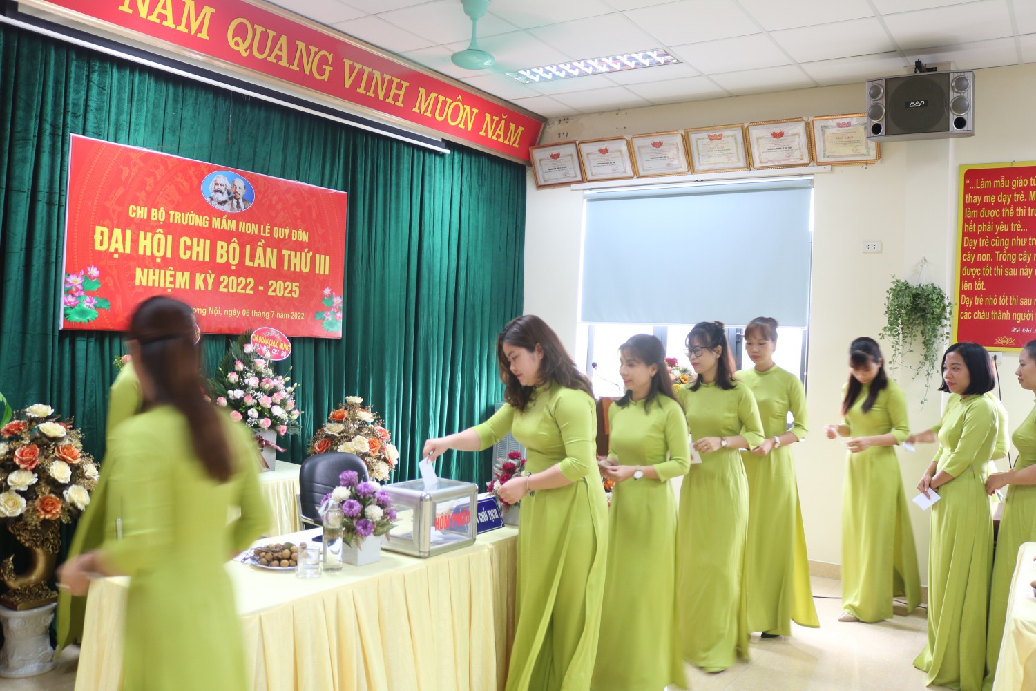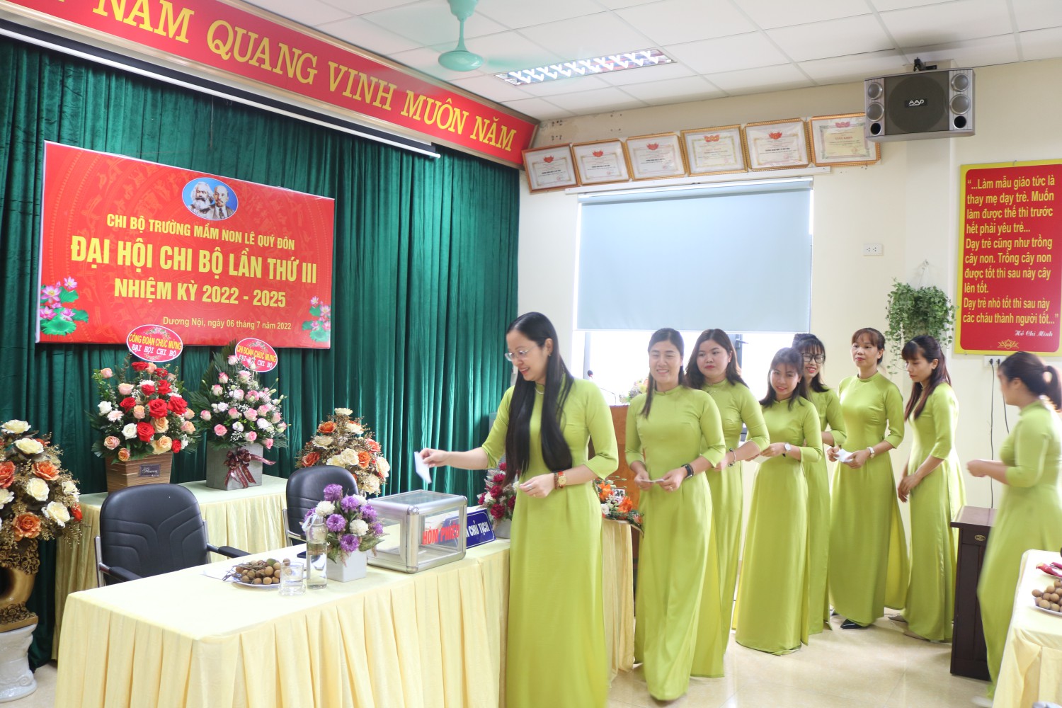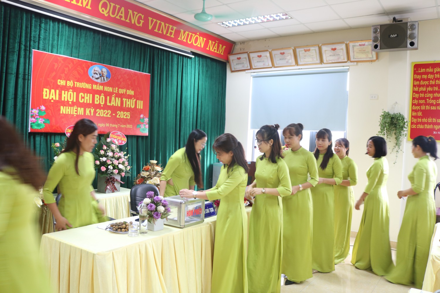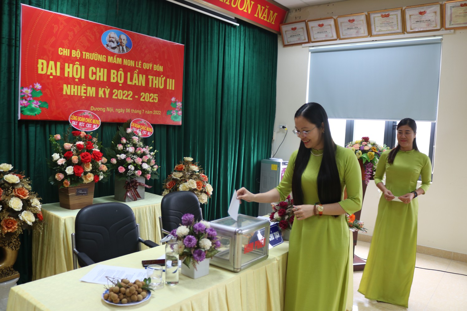Đại hội Chi bộ Lần Thứ III nhiệm kỳ 2022-2025 diễn ra trong ½ ngày 6/7/2022, với tinh thần làm việc nghiêm túc, đoàn kết, dân chủ, Đại hội chi bộ trường Mầm non Lê quý Đôn nhiệm kỳ 2022- 2025 đã thành công tốt đẹp và thống nhất bầu chi ủy chi bộ nhiệm kì 2022-2025 gồm 3 đ/c: 1 đ/c Đỗ Thị Kim Thu Hiệu trưởng nhà trường, đ/c  Chu Thị Hiên PHT, đ/c Nguyễn Thị Nhàn GV và bầu ra đ/c Đỗ Thị Kim Thu Bí thư chi bộ nhiệm kỳ 2022-2025.