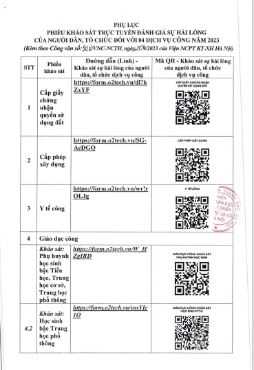 Thực hiện công văn số 508/VNC- NCTH ngày 25/9/2023 của viện NC -PTKT-XH Hà Nội. Kính mời các bậc PH cùng tham gia hưởng hứng lấy ý kiến khảo sát về công tác dịch vụ công của thành phố HN