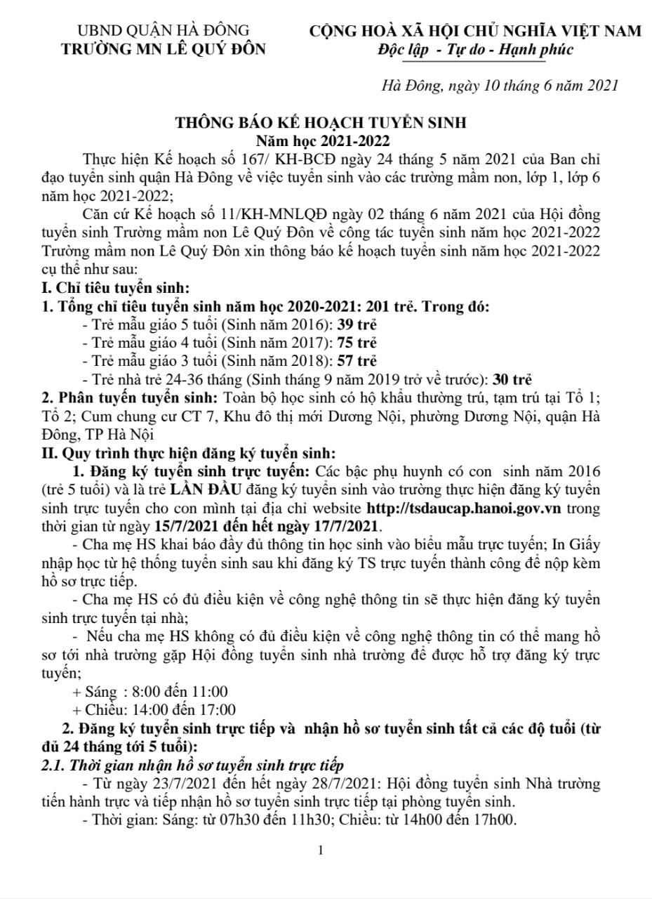 Căn cứ hướng dẫn và phê duyệt của Phòng Giáo dục và Đào tạo Quận Hà Đông, trường mầm non Lê Quý Đôn xin gửi tới các bậc phụ huynh kế hoạch tuyển sinh năm học 2021-2022