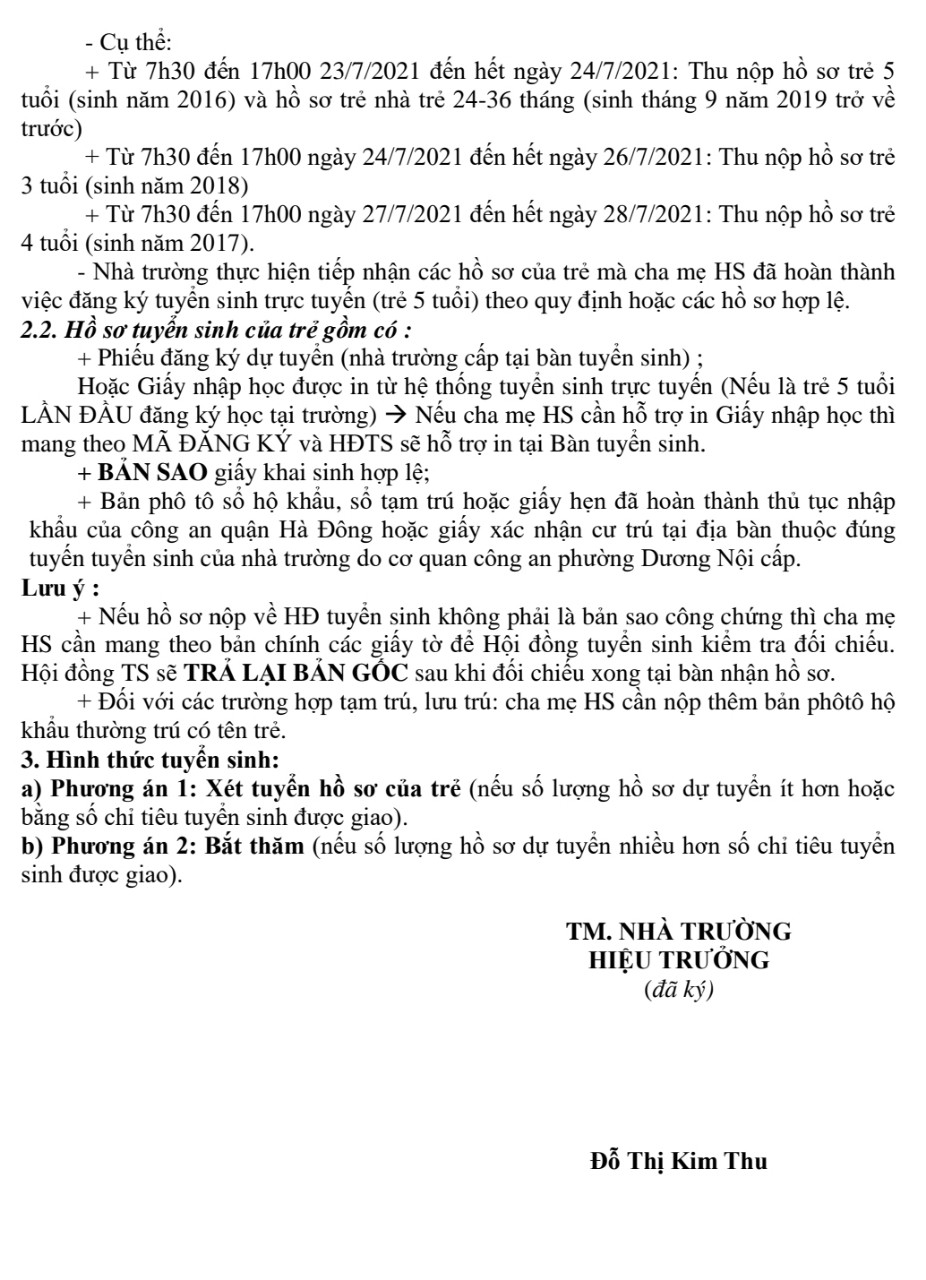 Các bậc phụ huynh lưu ý thời gian tuyển sinh trực tuyến và trực tiếp theo độ tuổi của trẻ và đảm bảo đến tuyển sinh cho các con đúng thời gian đã đưa trên thông báoxin trân trọng cảm ơn